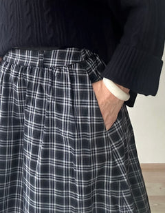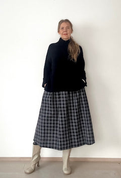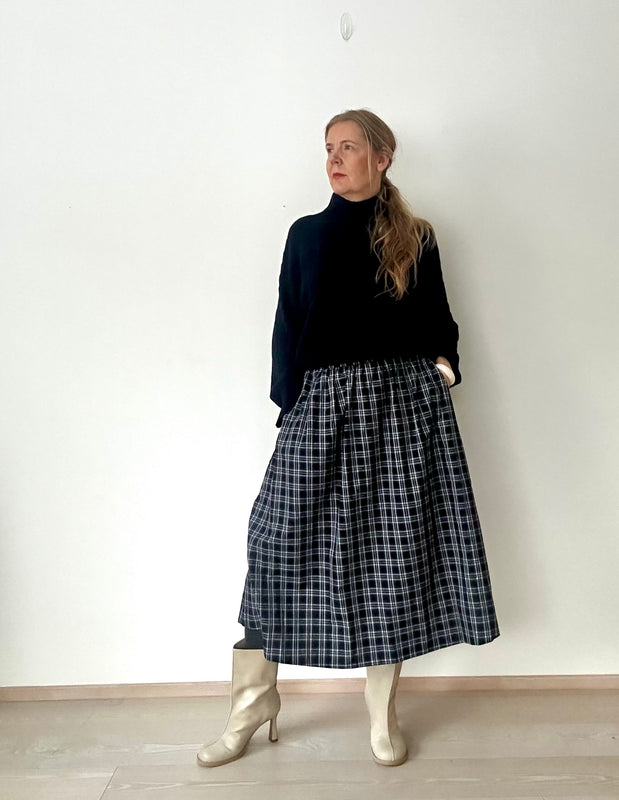 Jo somessa vilahtanut Kökar-ruutuhame tyylikkäässä ruutukuviossa on saapunut alkuvuoden uutuutena. Kauniisti laskeutuva ja ryhdikäs 100% puuvillakangas, jossa pienet laskokset vyötäröllä. Hameessa on vyötäröllä vyönlenkit ja takana kuminauha lisäämässä mukavuutta vyötärölle. Sivussa vetoketjukiinnitys ja sivutaskut. Hameen ruutukuviossa on tummansinisen, harmaan, mustan ja valkoisen sävyjä. Talvella alla on hyvä pitää alushametta, jotta kangas ei tartu sukkahousuihin.