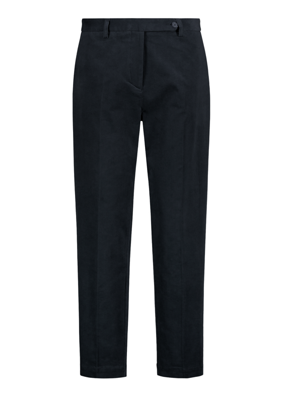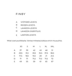Finby-housut upeassa tummassa puuvilla-pellava denimissä. Ryhdikkäässä Finby-housussa on kauniisti istuva vyötärölinja, jossa vyönlenkit, vetoketju sekä nappikiinnitys. Housut istuvat kauniisti ja suunnittelussa otettu huomioon lanteikkaan naisen muodot. Takana myös valetakataskut luomassa viimeistellyn ilmeen. Housun lahje kapenee hiukan. Materiaalina denim miellyttävä ja joustava päällä ja housu laskeutuu kauniisti. Kääntämällä lahjetta saat kivaa ilmettä.