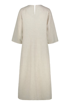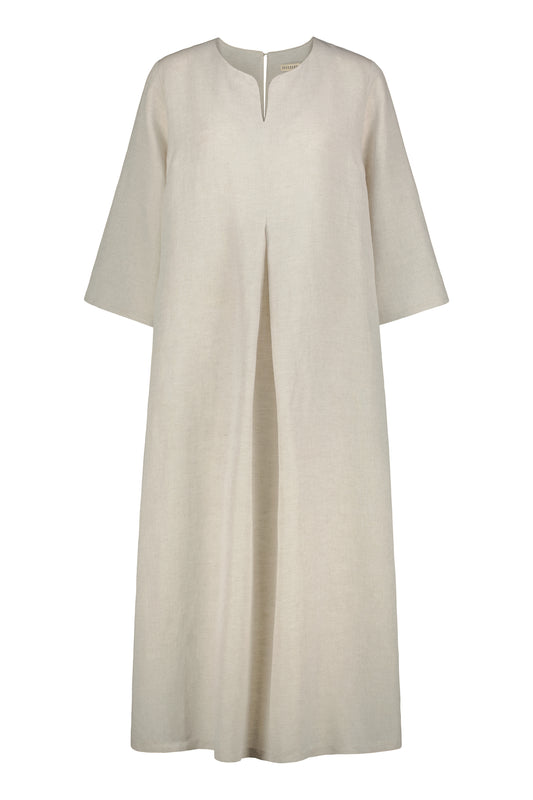 Hyppeis-pellavamekko on klassisen kaunis ja minimalistisen tyylikäs. Istutettu hiha tuo ryhdikkyyttä ja 3/4 hiha suojaa käsivarsia. Rumar-sarjasta tuttu huoliteltu halkio pääntie. Rintamuotolaskosten ansiosta mekko istuu kauniisti ja mallissa on hyvin tilaa rinnoille. Etuosan laskos antaa kivasti tilaa myös keskivartalolle ja lantiolle, jolloin helma laskeutuu kauniin suoralinjaisesti. Sivusaumassa taskut. Niskassa yksityiskohtana halkio ja nappi.
