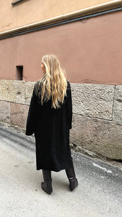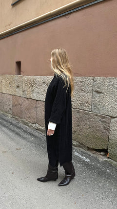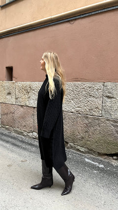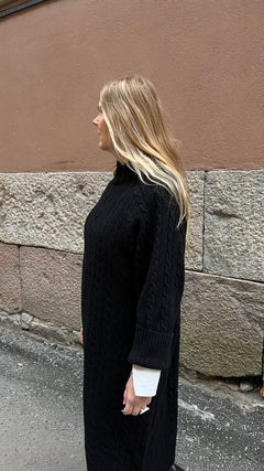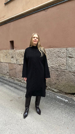 Myrskyluoto -sarja täydentyy ihanalla midimittaisella villamekolla. Myrskyluoto-villamekossa kevyt palmikkoneulos jatkuu koko matkalta kauniisti kaulukseen asti. Raglan hiha tuo rennon fiiliksen ja takaa hyvän istuvuuden. Materiaalina on kutittamaton pehmeä 100% mulesing vapaa merinovilla. Ohuempi neulos ja laatikkomainen malli on ylellisen ilmava ja sopii hyvin sisäpukeutumiseen ja kerrospukeutumiseen. Sivussa pienet halkiot. Yksinkertaisen tyylikäs midimittainen malli, jossa upea lettineulos pääsee oikeuksiinsa. Sävynä klassinen musta Korppi. Sama mitoitus kuin Myrskyluoto-villapaidassa. Alle suosittelemme pukemaan alusmekon.