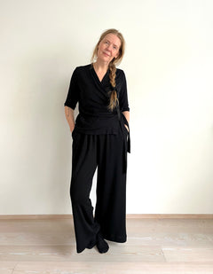 Loppuvuoden mallisto täydentyy ihanilla Näsby-housuilla ylellisen pehmeästä merinovillaneuloksesta. Näsby-housut ovat täydelliset siistit olohousut kotona oleiluun ja esimerkiksi kotitoimistolle sekä hyggeilyyn syksyn pimeneviin iltoihin. Housuissa on pitkä, suora ja leveä lahje. Vyötärölinjalla mukava leveä kuminauha ja sivussa taskut.